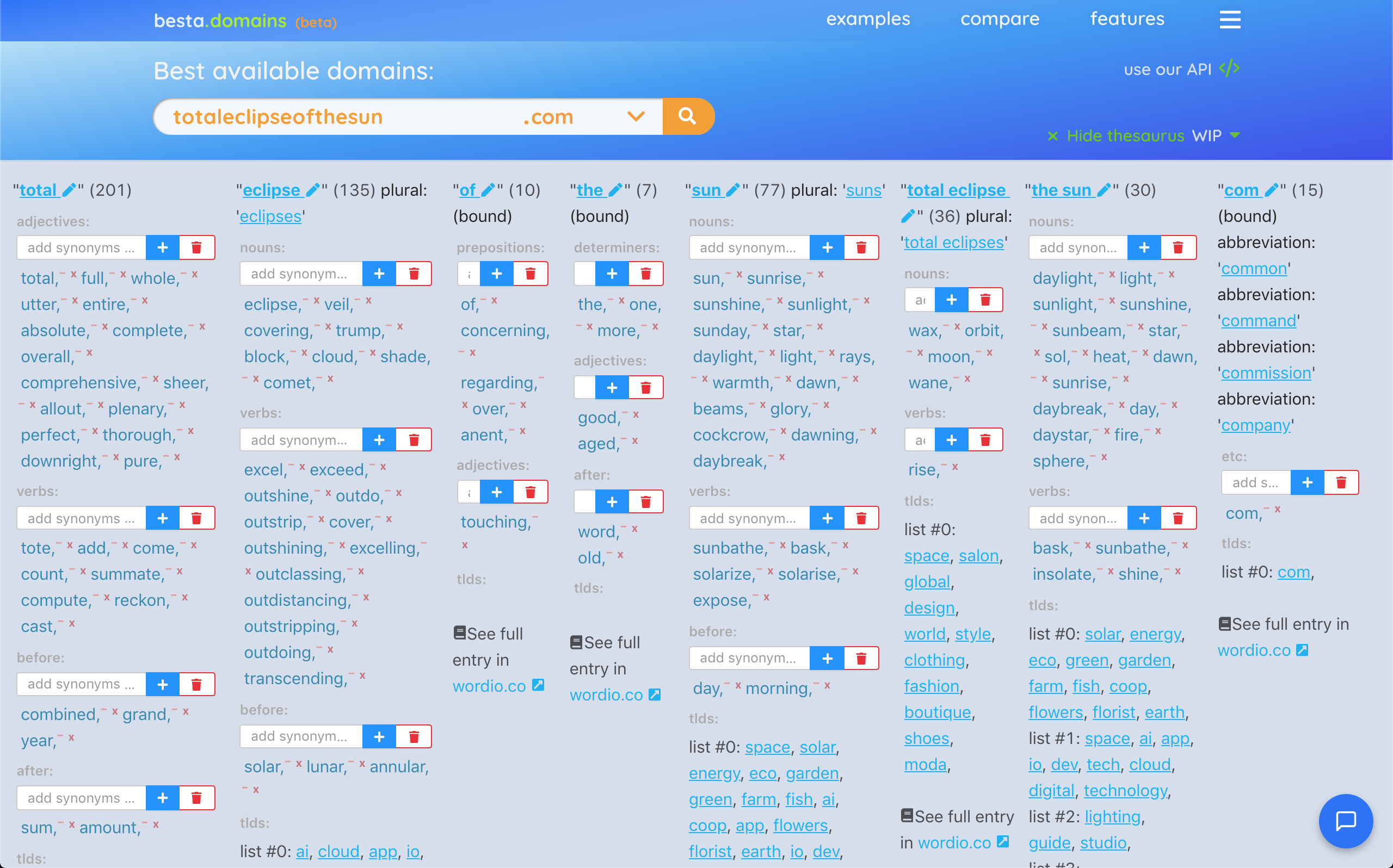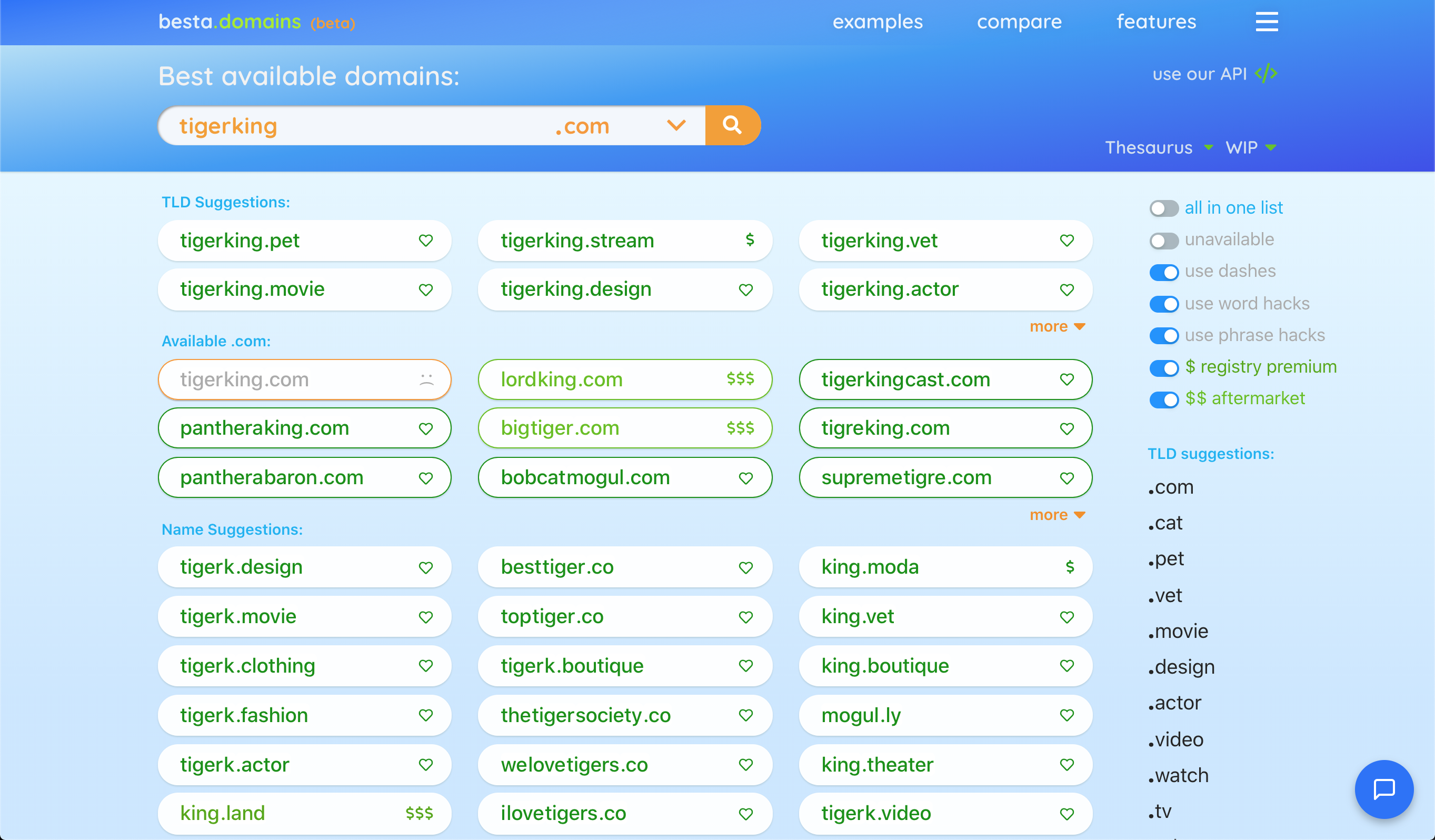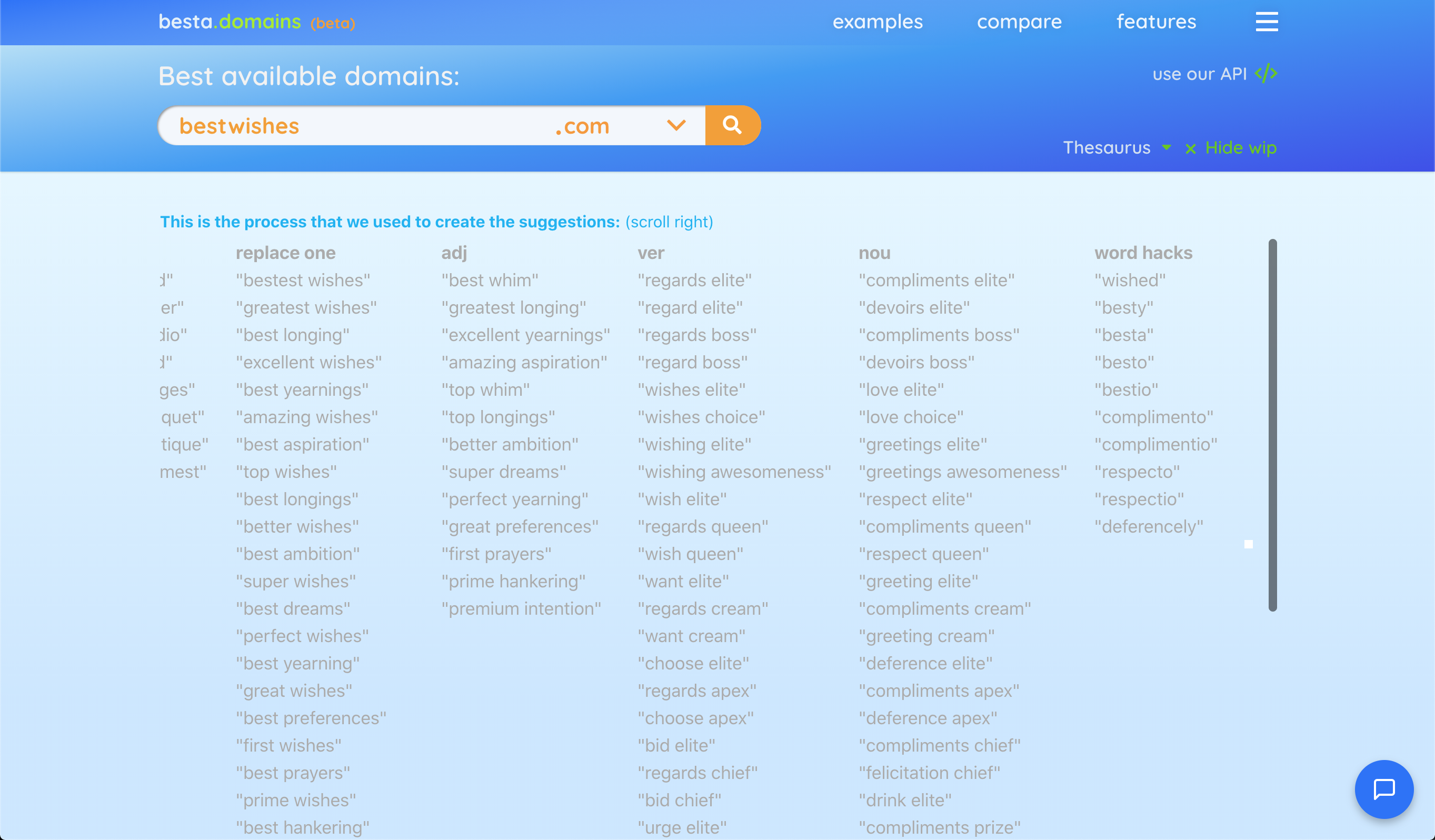 Besta.domains - The best domain name suggestions. App and API. It doesn't just search, but actually generates new phrases using Natural Language Processing! Also check availability of 100s of names at a time. Load balanced cloud of 10 servers returns results x10 faster. The front-end is optimized to check only the results which are in view.