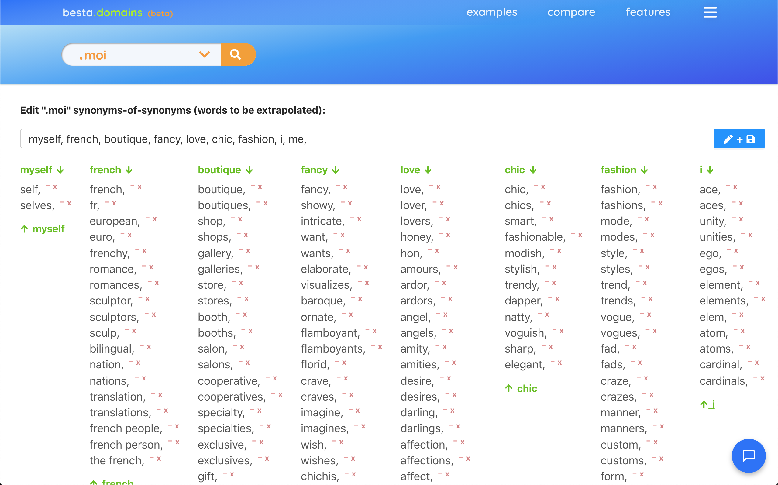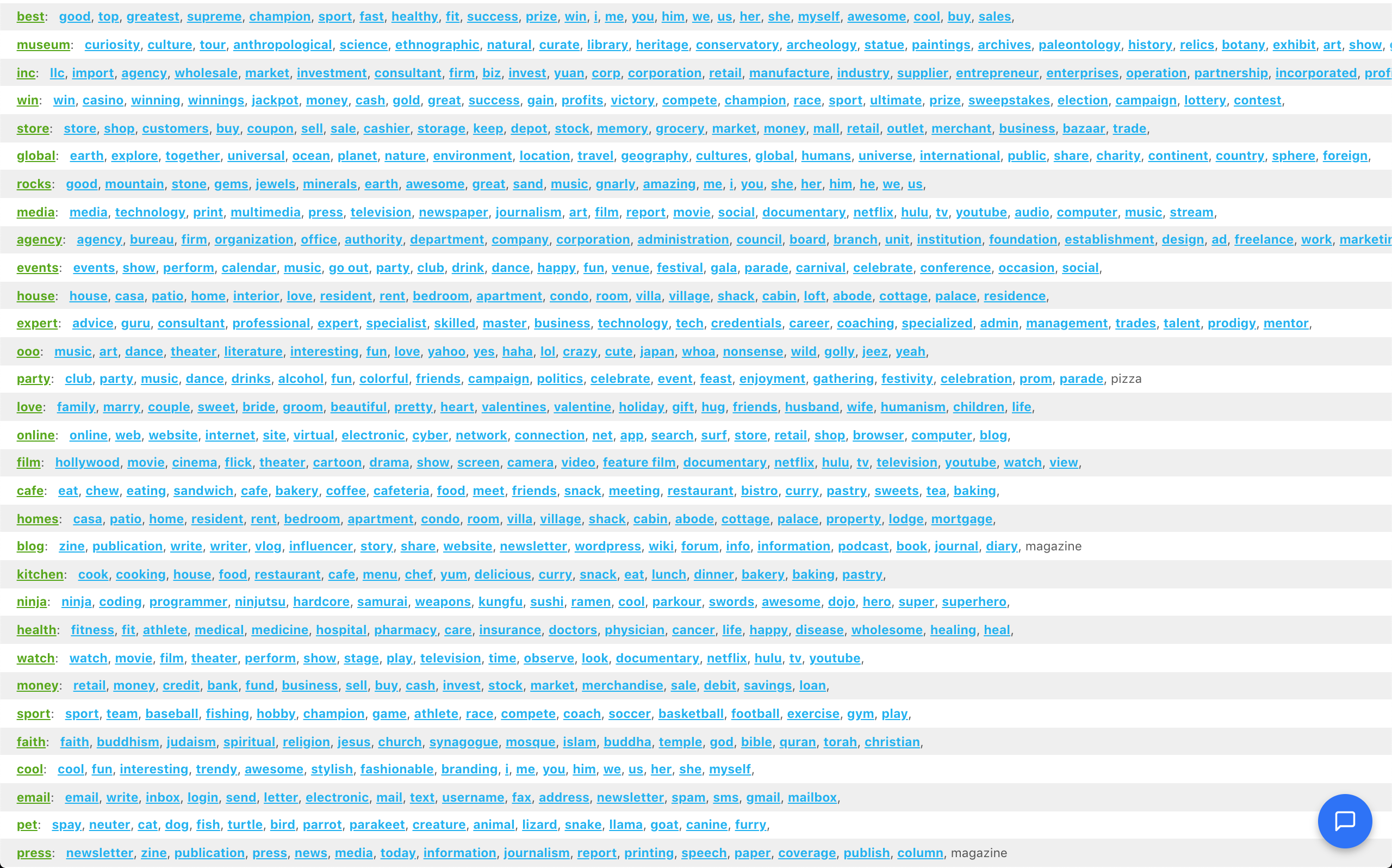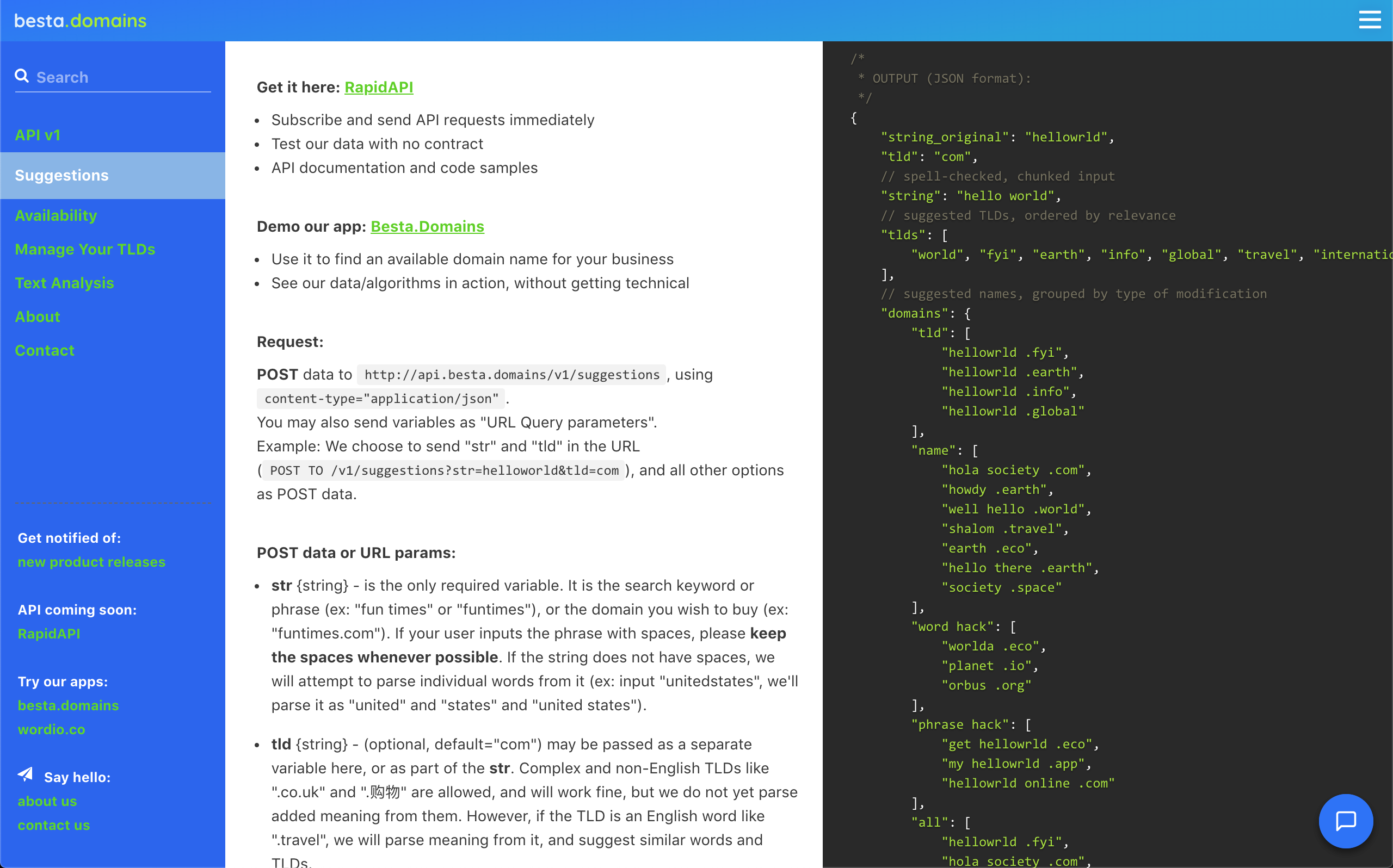 Besta.domains - The best domain name suggestions. App and API. It doesn't just search, but actually generates new phrases using Natural Language Processing! Also check availability of 100s of names at a time. Load balanced cloud of 10 servers returns results x10 faster. The front-end is optimized to check only the results which are in view.