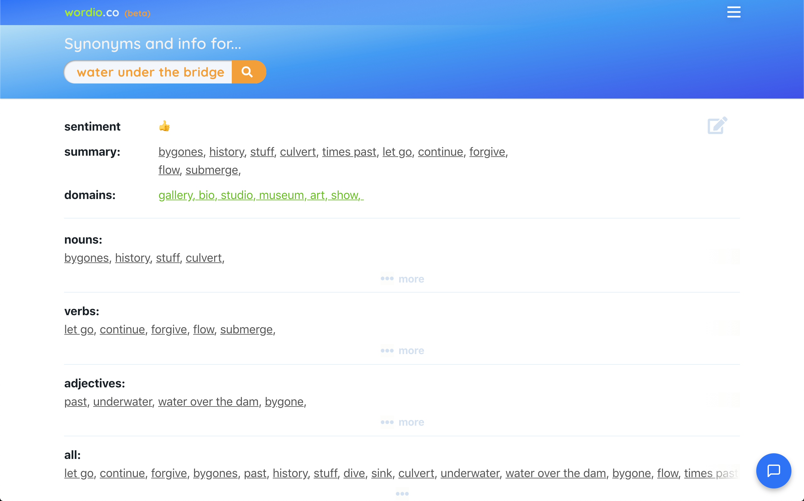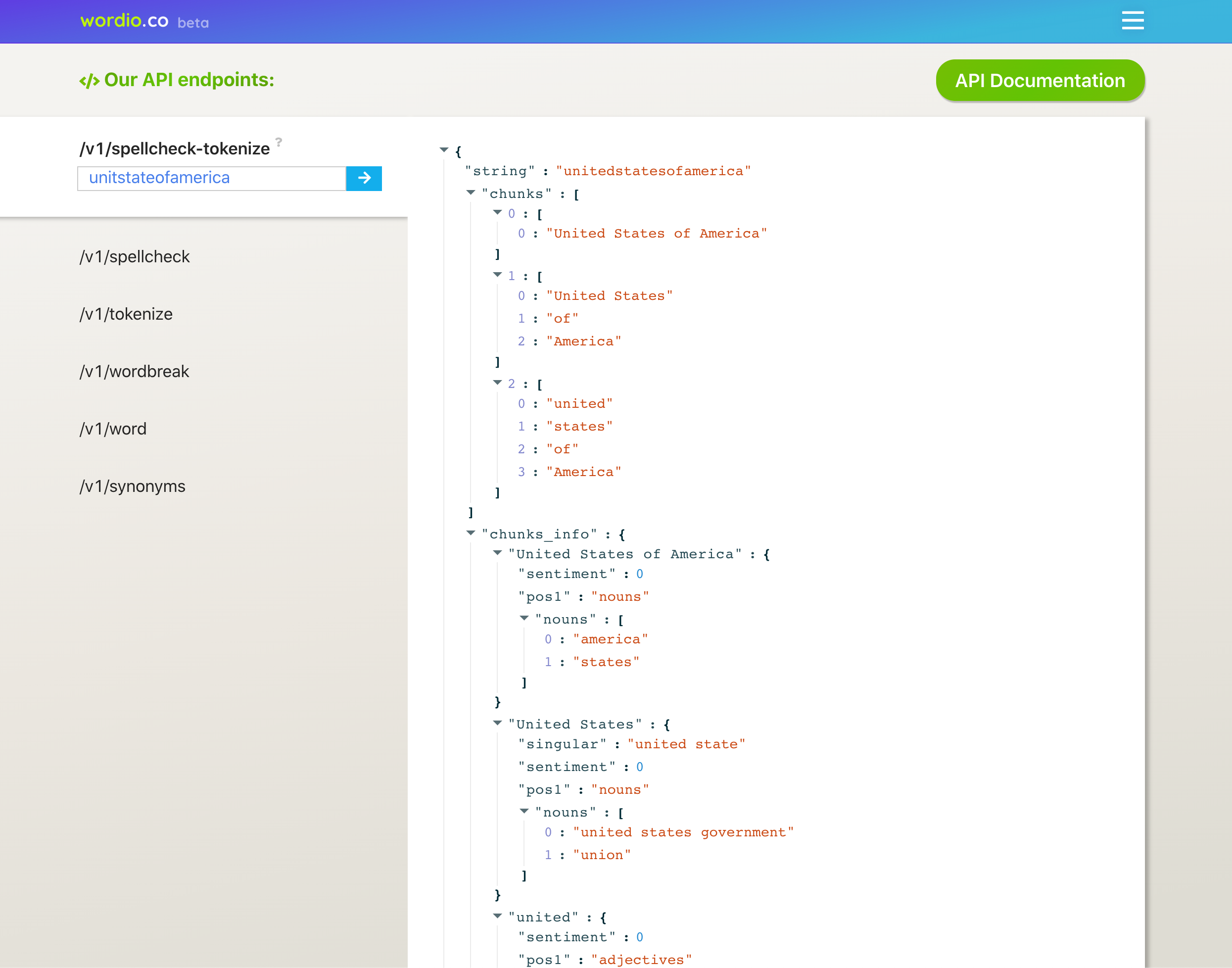 Wordio.co - Wrote some linguistic APIs and algorithms, for AI, writing, or search applications. Compiled and edited a thesaurus of 300,000+ words. Find the root-word, parts-of-speech, sentiment analysis, abbreviations, contractions, singular/plural, etc. Get synonyms and related words, organized by sentiment. Word-breaking, tokenization, lemmatization and spellcheck on text inputs without spaces.